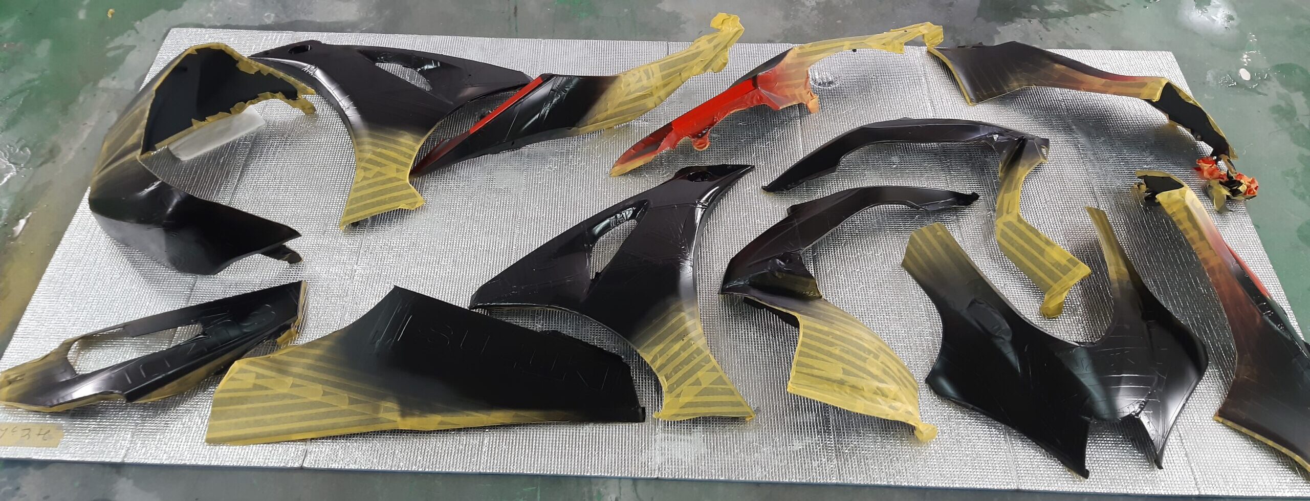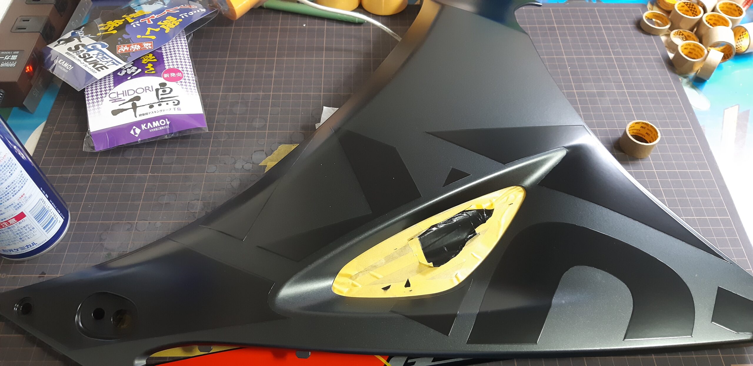 塗装後、マスキングを剥がしていきます。
