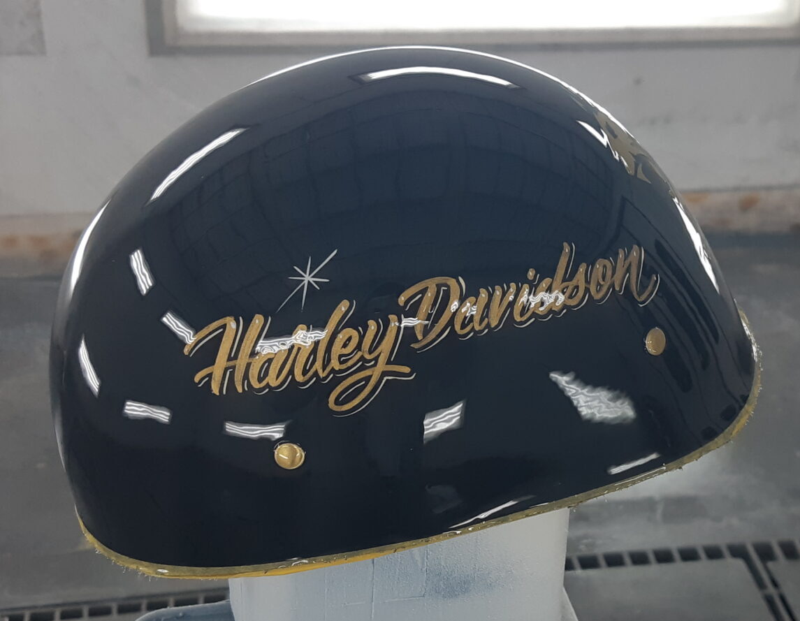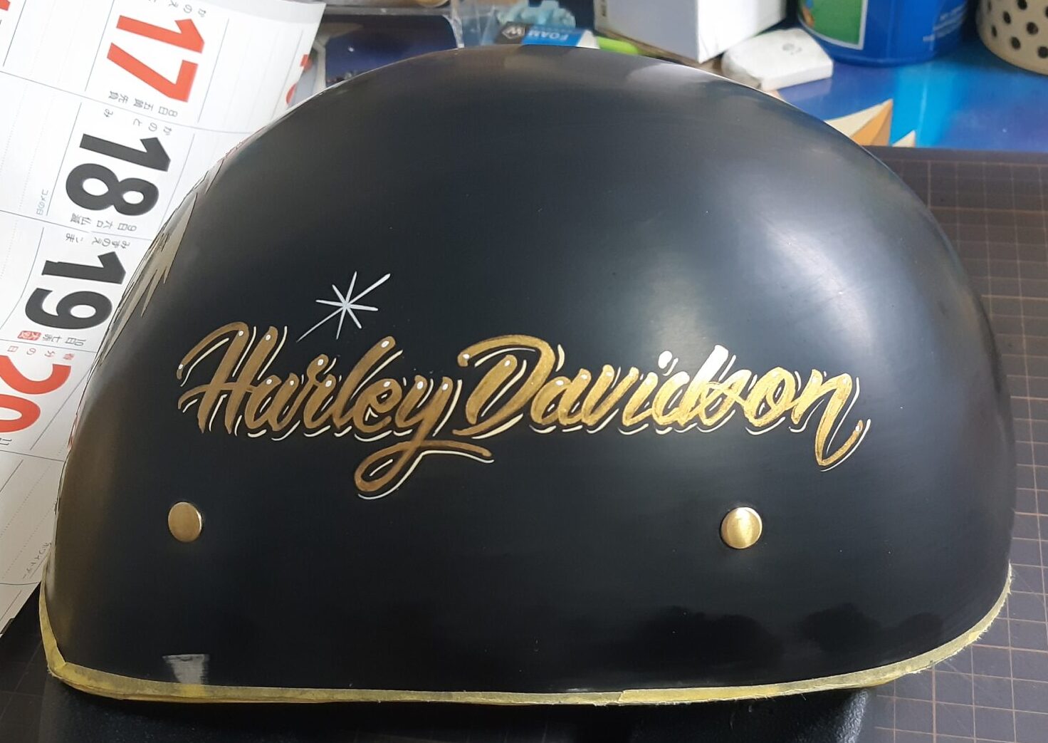 ロゴの塗装が終わり、ピンストライプの施工の為